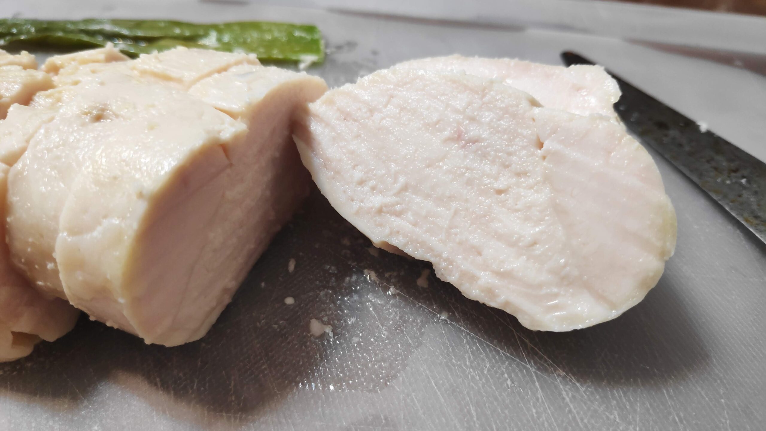 - むね肉はスライスした断面がテカるくらいの水分量を残す。